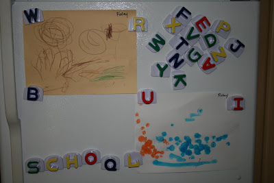 At exactly noon, the doors opened and children started streaming out single file. Some burst right into tears upon being reunited with their lost parents. And Dash and I waited. Fin was the LAST child out of his classroom and only then at the prodding of his teacher letting him know I was waiting. But my dissappointment was shortlived, as he immediately launched into showing me his artwork (a crayon drawing and a dot painting) and explaining it (there was a traced hand, a circle, an attempted "F"), thanking me for his treats in his lunchbox (which made me feel like I had really done something right), and then detailing the misdoings of a certain Sophie (who apparently pushed down Owen - Miss Annette told her that wasn't nice - and stole a drumstick from Fin - Miss Annette told her not to steal - and tried to take said lunchbox treats - Fin told her SHE wasn't nice!) Then he grabbed his baby brother by his little head, told him how much he missed him and gave him a big smooch. Ahhh, here's that verbose child I missed so much...