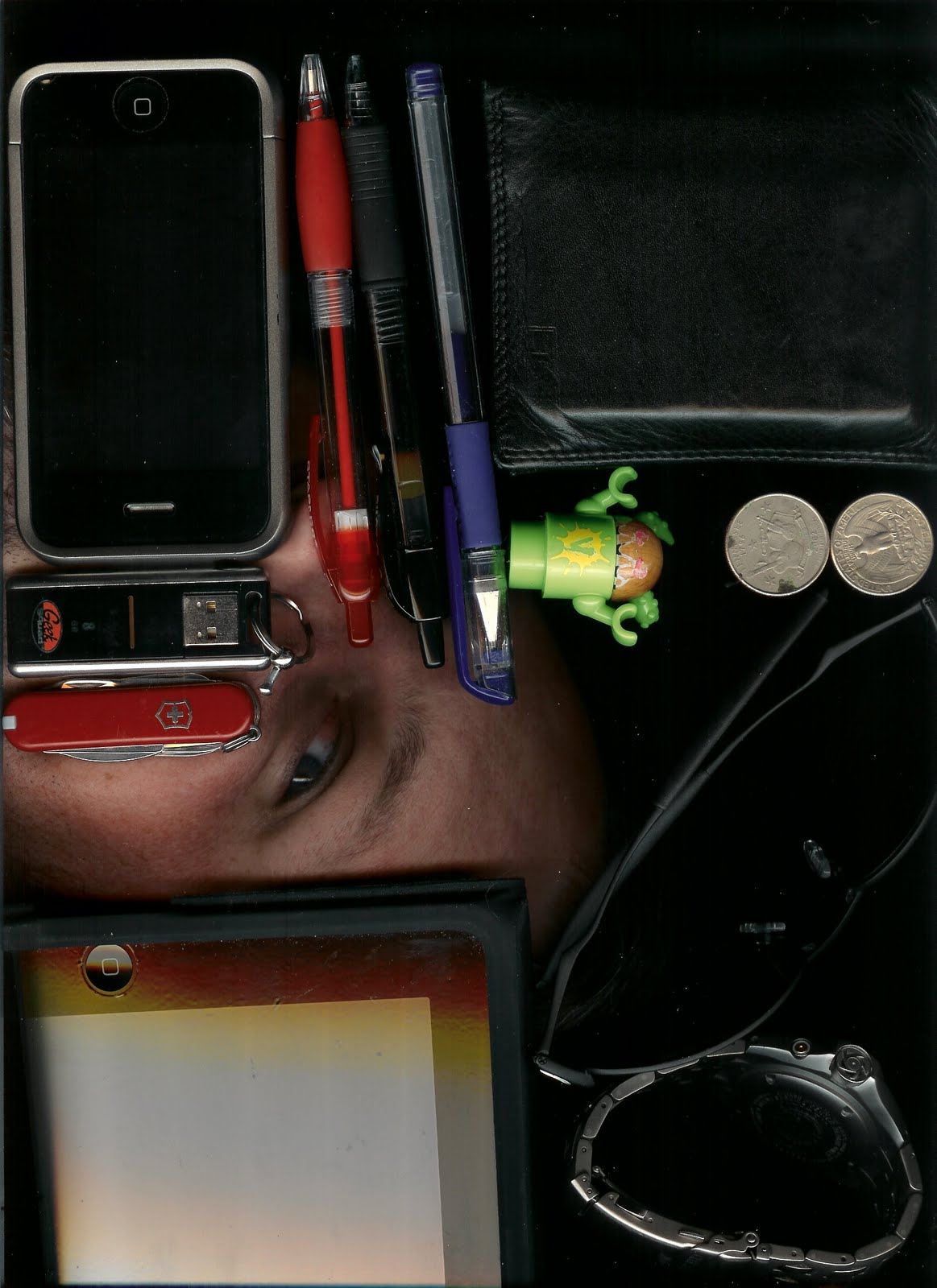 This week, my Photojojo newsletter sent me to this site: Face Your Pockets. The basic idea is that you take everything out of your pockets/purse, toss them on the scanner and then smash your face in and scan. How can you not want to try it yourself! Brooks and I had to play. We sent our entries in, but here they are :)