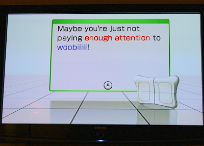 I still try and Wii-Fit at least twice a week. This usually consists of me doing a few things and then supervising Fin ski jumping, soccer ball heading or penguin fishing. But when I fired up my Wii Fit yesterday I was met with an interesting exchange.